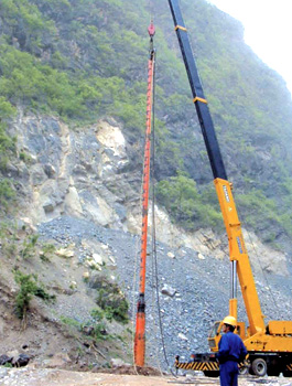 振沖器是振沖法施工中的特制機具。它產(chǎn)生水平向振動力振擠填料及周圍土體,而達到提高地基承載能力、減少沉降量、增加地基穩(wěn)定性、提高抗地震液化能力。 振沖法施工時除原地沖器外,尚需行走式起吊裝置,泵送輸水系統(tǒng),控制操作臺等。如工程單位缺乏起重機,本廠還供應(yīng)振沖器施工樁架,樁架有單邊滾管立柱式、液壓步履式、簡易履帶式等。